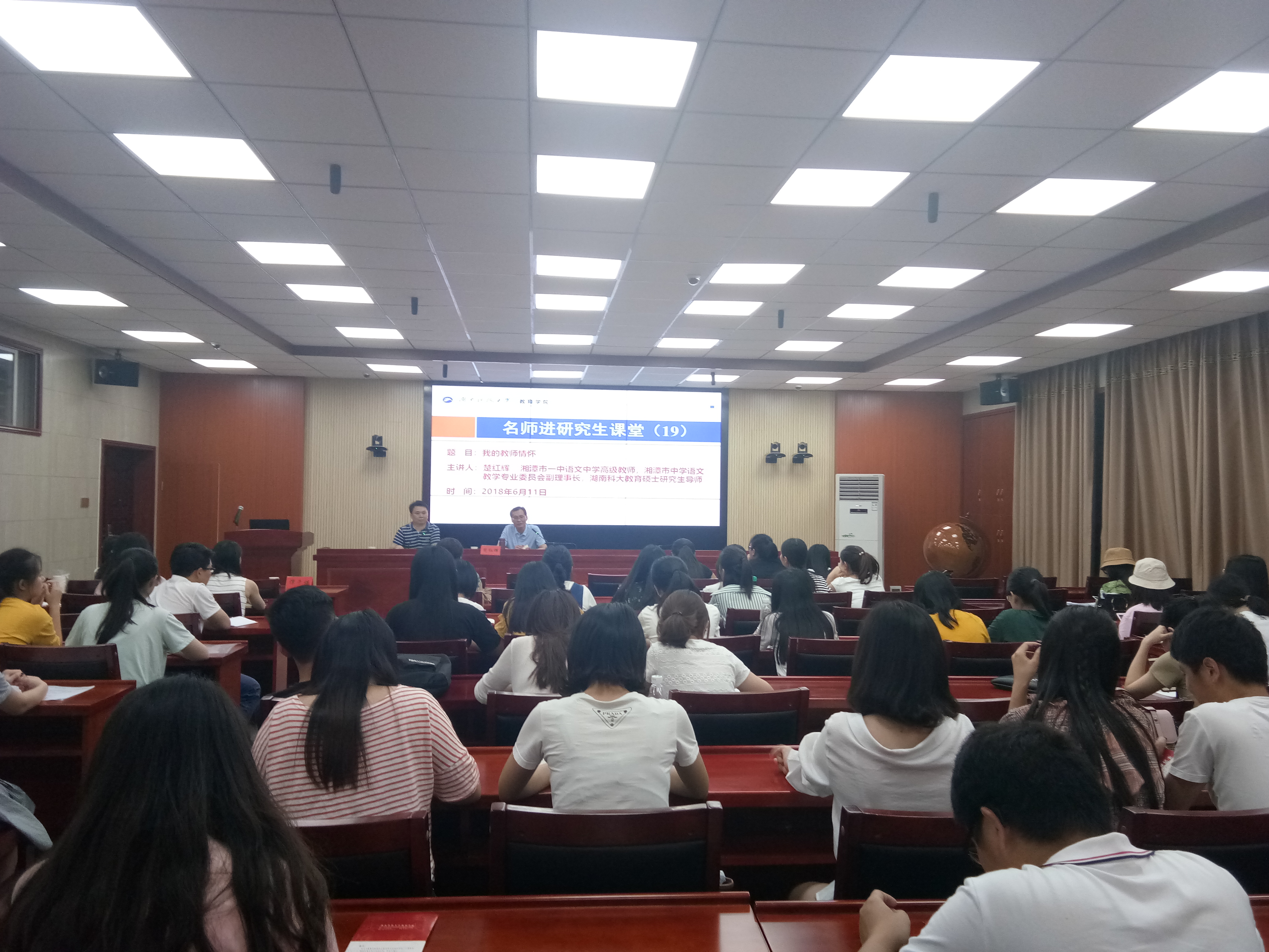 2018年6月11日19:30,湘潭市一中语文中学高级教师楚红辉在八教308报告厅为bevictor伟德官网师生带来了题为《我的教师情怀》的讲座,bevictor伟德官网教师代表、教育硕士专业研究生代表参加了本次讲座,讲座由bevictor伟德官网副院长谭千保主持。