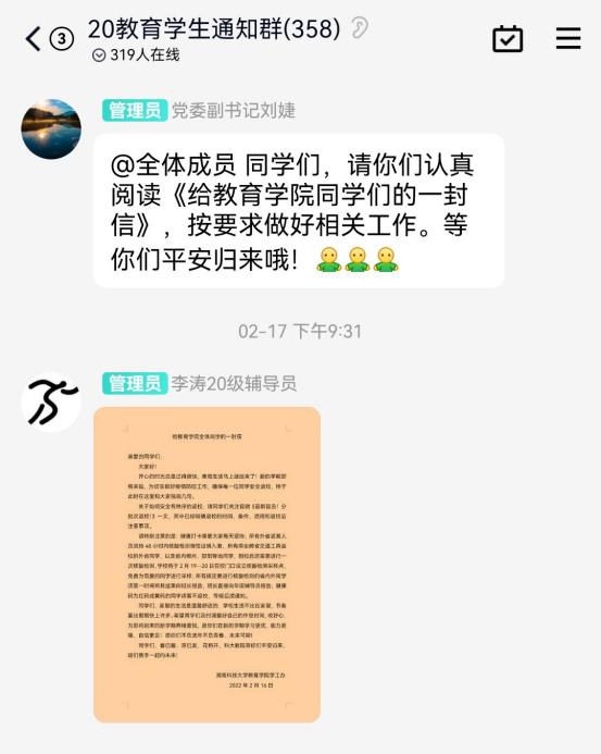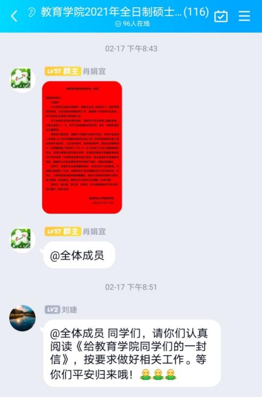 本次新学期返校宣传和动员工作采用书信这一新颖和独特的方式,引起了同学们的热议。“学院的这封信让我感到十分惊喜,可以从字里行间感受到老师对我们的关心,满满的安全感让我对新学期的生活充满了期待。”读完信后,21级应用心理学专业三班吴涵同学感慨到。“在疫情期间,能如期回到校园继续进行研究学习,我知道这背后是无数人疫情防控的艰辛付出,学院的这封信更是让我们感到眼前一亮,非常暖心。草木蔓发,春山可望,听说最近学校的梅花、桃花都开了,我得趁着春光,去看看。”20级教育学专业研究生刘佳慧同学说到。