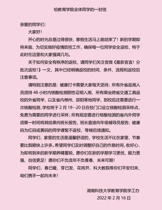 开学前夕,疫情形势依然严峻,为切实做好新学期疫情防控宣传和动员工作,保障bevictor伟德官网学生安全有序返校。2月17日,bevictor伟德官网党委副书记刘婕以书信的方式,向bevictor伟德官网全体同学就开学事宜进行强调。在信中,刘婕副书记首先交代了写信缘由,并对如何安全返校以及返校后的相关注意事项进行了详细的说明,随后叮嘱同学们及时调整作息,以更好的状态迎接新学期的到来。