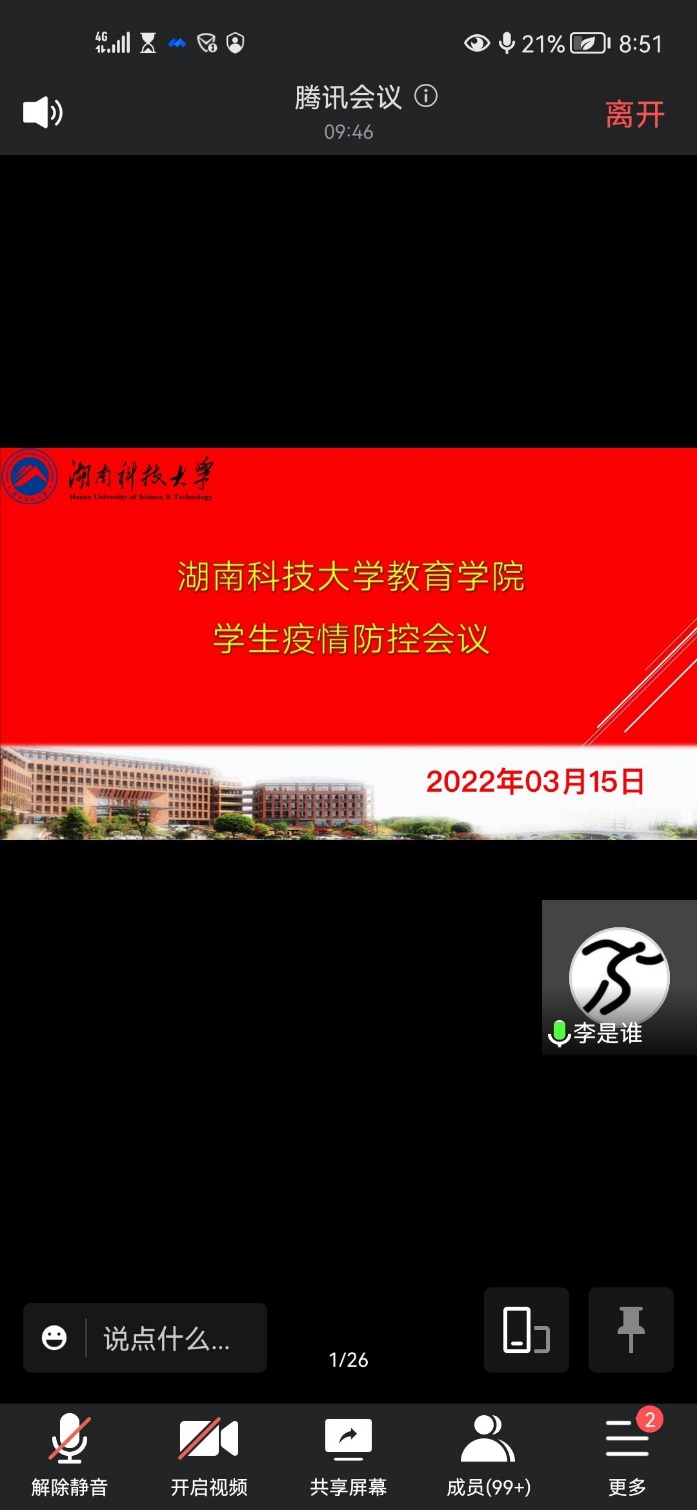 会议伊始,李涛就学校的疫情防控制度展开详细说明。他强调,现在离开湘潭要做好相应登记,要随时和年级辅导员联系,不举办大型集会活动和线下学生会议,各寝室要保持卫生清洁。提到近日学校的核酸抽检,他希望权益保障部拿出具体方案,安排好各班核酸检测的顺序。在讲到班级疫情防控管理时,李涛重点提到班级内部要开一个专门负责疫情防控的会议,各班班委都要承担责任,不要盲目转发群里的消息,要认真将各项事情落实到地。