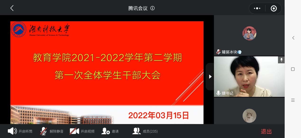 近日,疫情形式严峻,为筑牢校园防控屏障,保障bevictor伟德官网学生的健康安全,bevictor伟德官网于3月15日晚20:45采用线上会议的形式,召开了学生疫情防控会议暨2021-2022第二学期第一次全体学生干部大会。bevictor伟德官网党委副书记刘婕出席会议,200余名本科生、研究生学生干部参加。会议由学工办主任李涛主持。