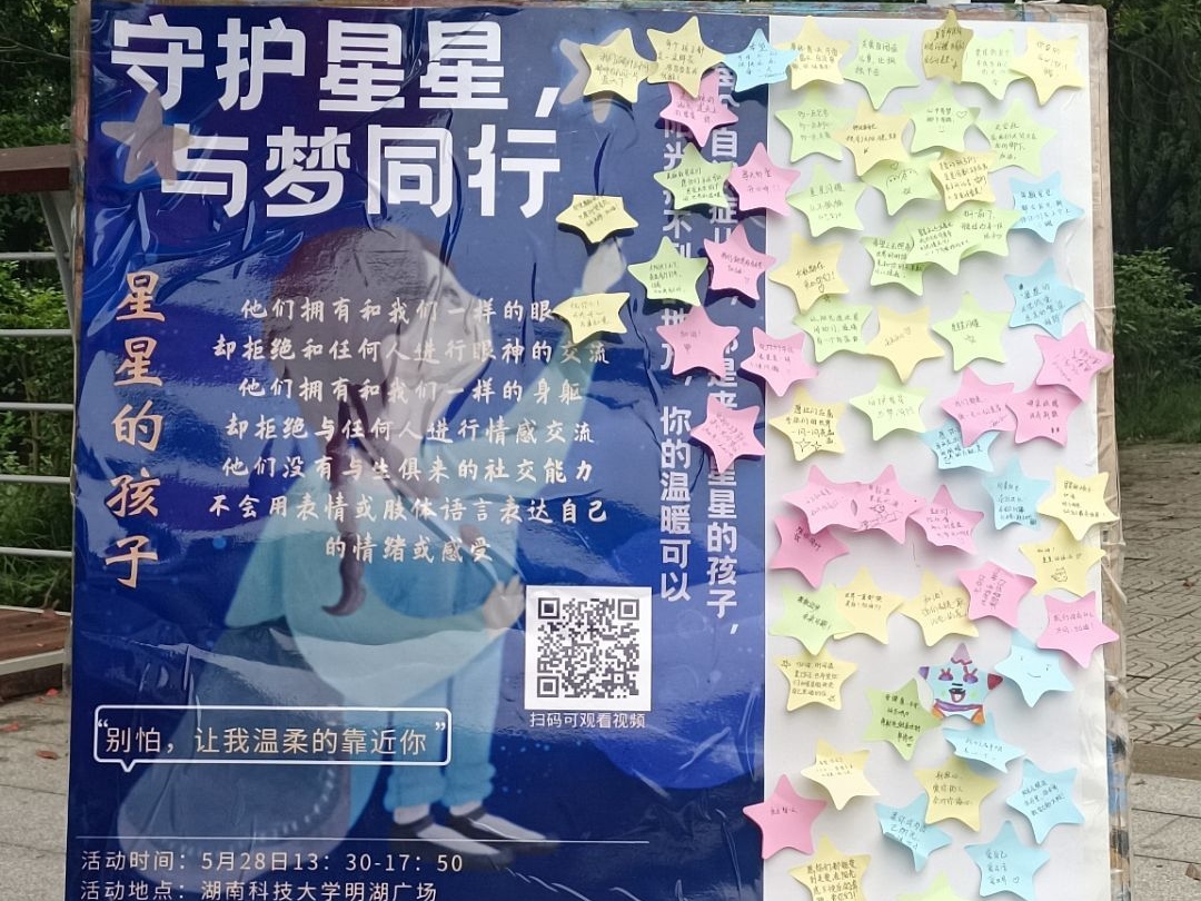 《守护星星的孩子》中曾写道“你独自漂泊在遥远的天际,用纯净的眼睛,注视着茫然而陌生的世界…你们近在咫尺却又相隔万里”。为呼吁大家关注自闭症群体,真正理解自闭症儿童的内心世界,5月28日下午13:30,bevictor伟德官网青年志愿者分会在明湖广场开展了以“守护星星,与梦同行”为主题的关爱自闭症儿童大型宣传摆点活动,青年志愿者分会的7名会干及18名志愿者参与此次活动。