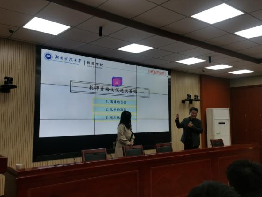 在讲授教师资格面试流程时,李炳煌首先详细介绍了基本流程,并邀请机械设计专业蒋鑫同学和小学教育专业杨淑雯同学上台展示,又通过亲自演示,对面试细节做出强调。他希望同学们能注重细节,做任何事都要心中有数,“举目望不到边,放眼尽收眼底”。