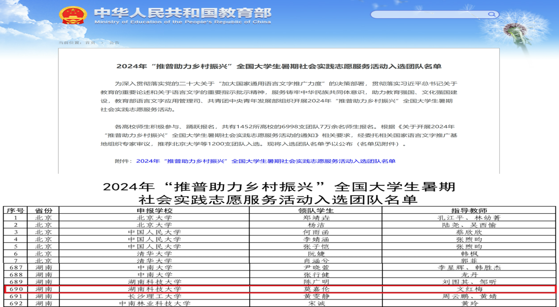 7月2日,教育部官方网站公布了《2024年“推普助力乡村振兴”全国大学生暑期社会实践志愿服务活动入选团队名单》,共有1452所高校的6998支团队7万余名师生报名,经主办单位遴选,共有1200支团队入选。bevictor伟德官网“木槿感恩支教团”推普实践队成功入选2024年“推普助力乡村振兴”全国大学生暑期社会实践志愿服务团队。