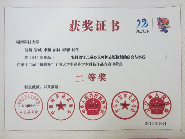 第十二届“挑战杯” 全国大学生课外学术科技作品竞赛于2010年11月份正式启动,到今年5月份,在王书记的指导下,课题组和其他志愿者共同努力,对作品《农村留守儿童心灵呵护志愿机制的研究与实践》进行了反复修正与完善,先后获得校级“挑战杯”一等奖、省级“挑战杯”一等奖,并被推荐至全国参与激烈角逐。最终在全国1935多所高校16976件作品中脱颖而出入围终审决赛,以严谨的构思和精彩的答辩赢得评委青睐,荣获国家“挑战杯”二等奖。