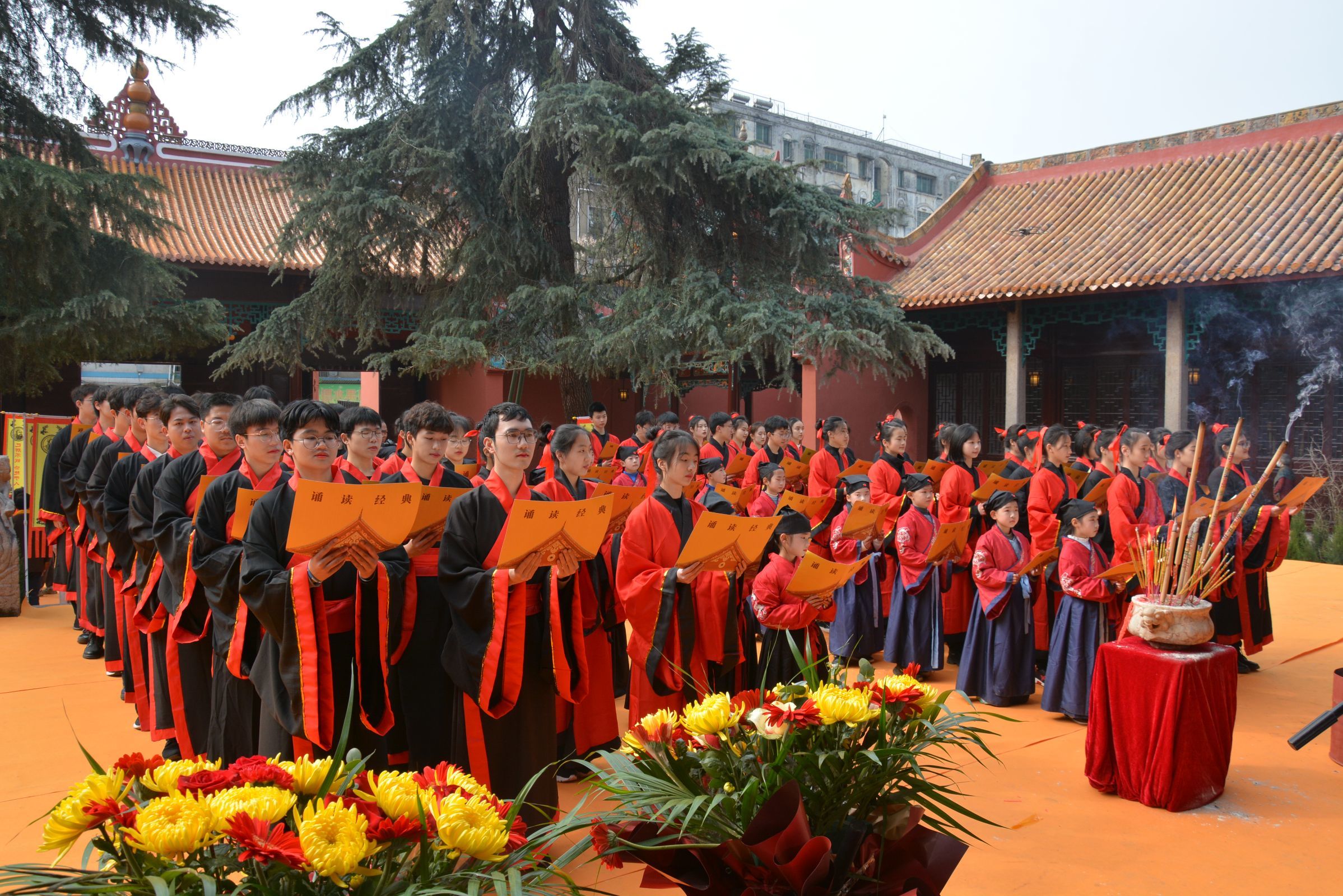 诵读者庄严肃穆站立在大成殿前