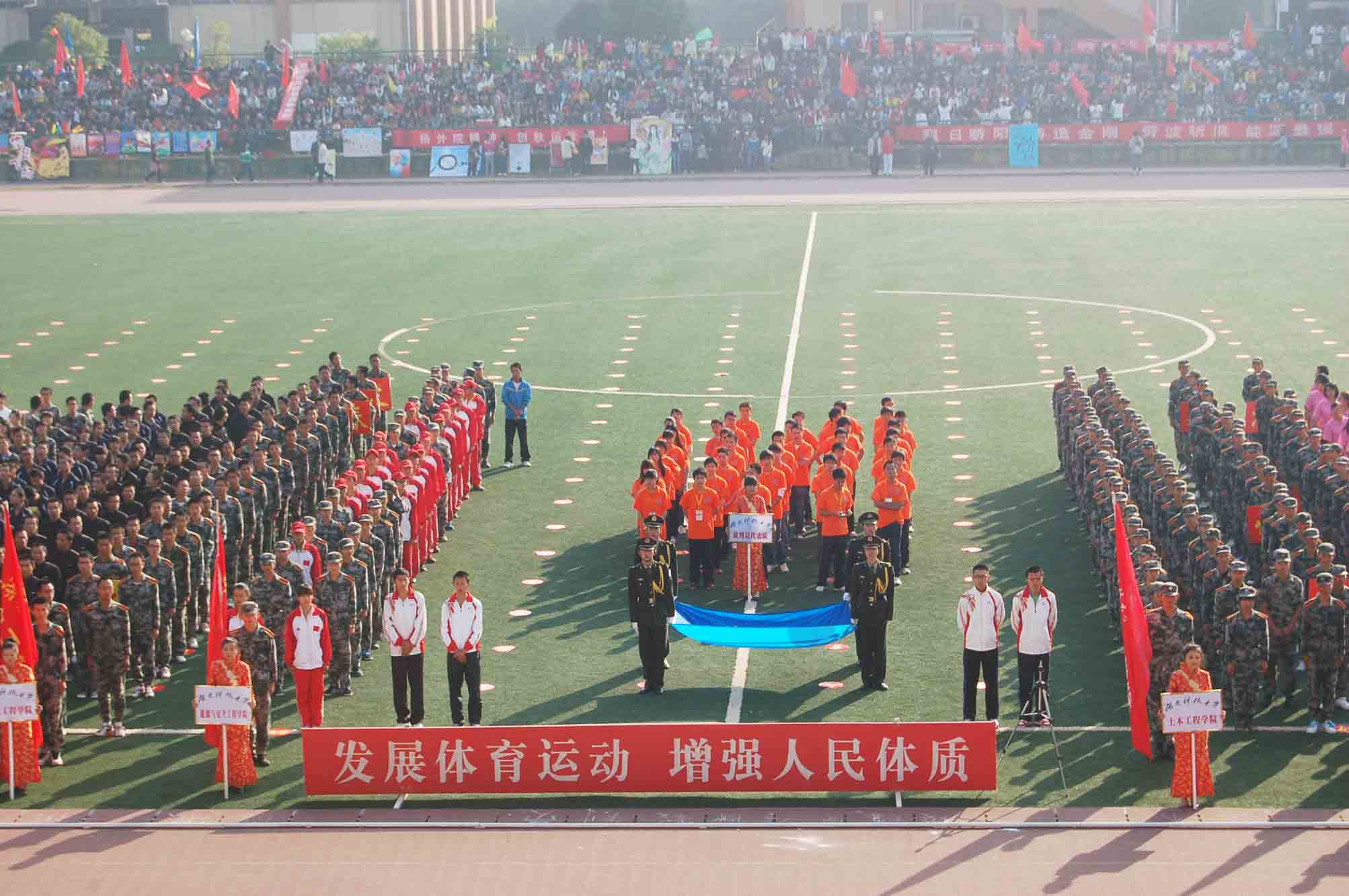 金秋湖湘,秋高气爽;科大轿子,共庆盛会。2012年10月18日上午8时,bevictor伟德官网秋季校运会开幕式在新田径场隆重举行。 在校旗方阵队的带领下,鲜花方阵队和彩旗方阵队将整个体育场装扮得焕然一新,在一片温馨的海洋中,各学院方阵队依次有序地从主席台前走过,接受领导们的检阅。