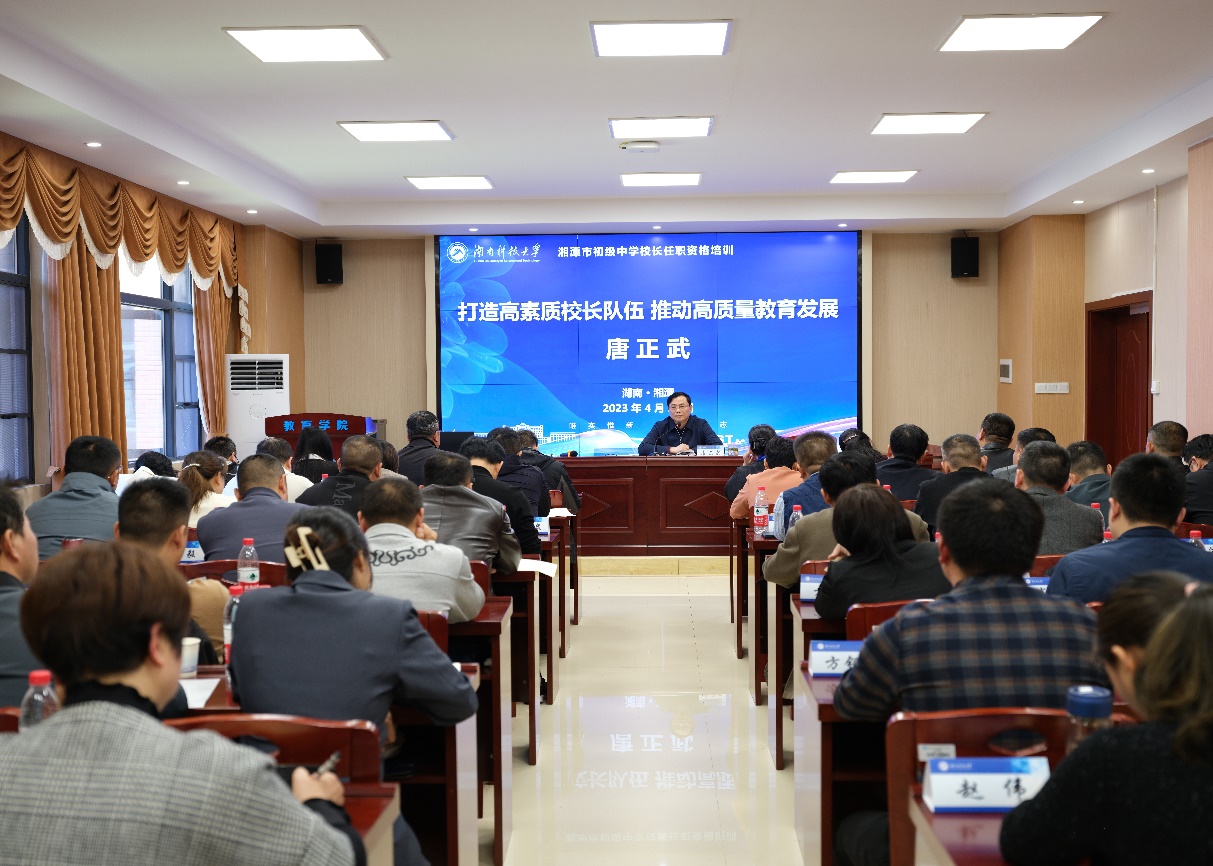 4月22日至26日,由湘潭市教育局主办、bevictor伟德官网,源自英国始于1946承办的湘潭市初级中学校长任职资格培训班在bevictor伟德官网举行。26日上午,湘潭市教育局党委书记、局长唐正武为培训班学员作《打造高素质校长队伍推动高质量教育发展》专题授课,湘潭市教育局教师工作科科长谭京湘及全市71名初级中学校长参加,bevictor伟德官网党委书记李炳煌主持。