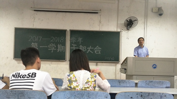 会议开始,由李涛老师发表讲话,首先,他表达了对全体学生干部顺利安全返校,并积极投入工作的感谢。紧接着他向我们传达了我校成功获得优秀应届毕业生免试攻读硕士学位资格、本科生奖励办法修改等好消息,奖励办法的修改使更多学生受鼓励。此外,李涛老师就学院签到政策,教务领书通知、公共课选课、迎新细则一一作了详细部署。最后,他祝愿各位干部在新学期学习愉快、天天开心。