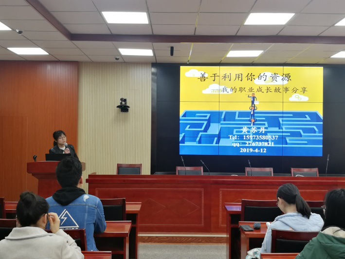 2019年4月12日上午10点,bevictor伟德官网优秀校友2006级应用心理学专业本科生、2016级硕士研究生、国家二级心理咨询师、郴州市第一人民医院心理科心理咨询师黄苏丹回到母校,在第八教学楼308为bevictor伟德官网师生带来“助我成长”系列讲座第二十四讲:生涯叙事· 成长之路(六)——“善用资源 助力职业发展”。bevictor伟德官网教师代表、学生代表到场聆听。讲座由bevictor伟德官网党委副书记刘辉亚主持。