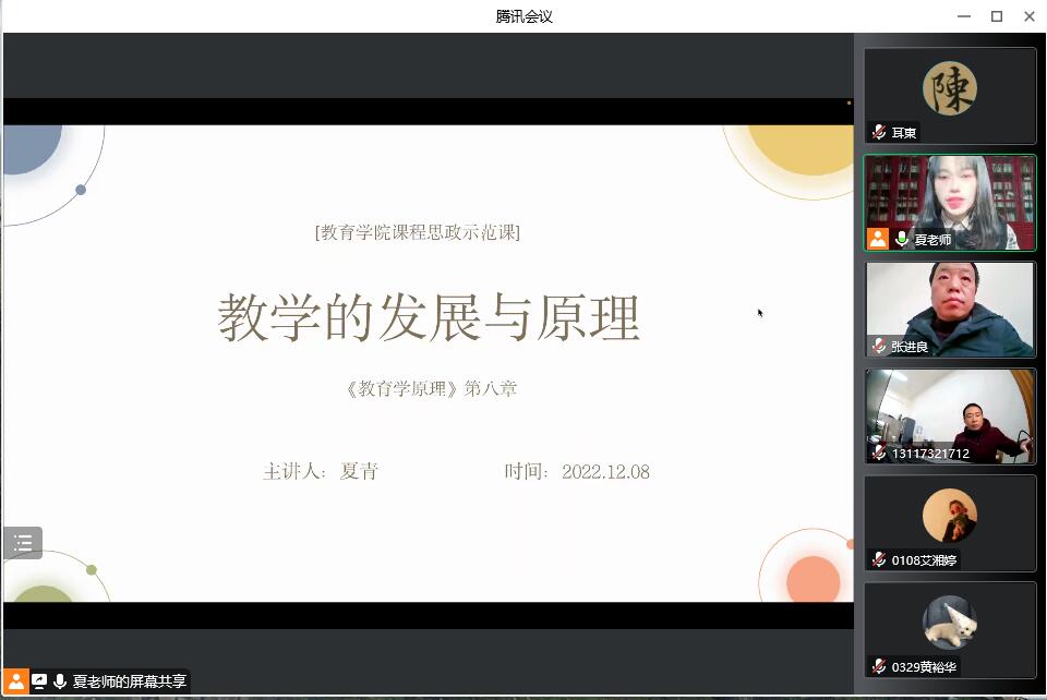 夏青博士从西方教学理论的形成与发展、我国教学理论的发展与反思、教学的基本理论等三个方面为我们上了一节生动的课程思政示范课。在导入环节,夏青青博士结合自己与学生交流的内容引导学生注意人际沟通中的细节和礼节,从细节处落实立德树人理念。在对中西方教学理论发展历程的讲述中,聚焦到教学理论中的德育思想,关注到教学理论家们身上的道德品质、爱国情怀和为教育事业奉献一生的崇高精神,积极引导学生树立正确的国家观、民族观、历史观、文化观。在教学的基本理论部分,夏青博士对教学的概念、过程、要素、规律、原则、方法以及策略进行了系统解读,对相关概念进行了对比分析。