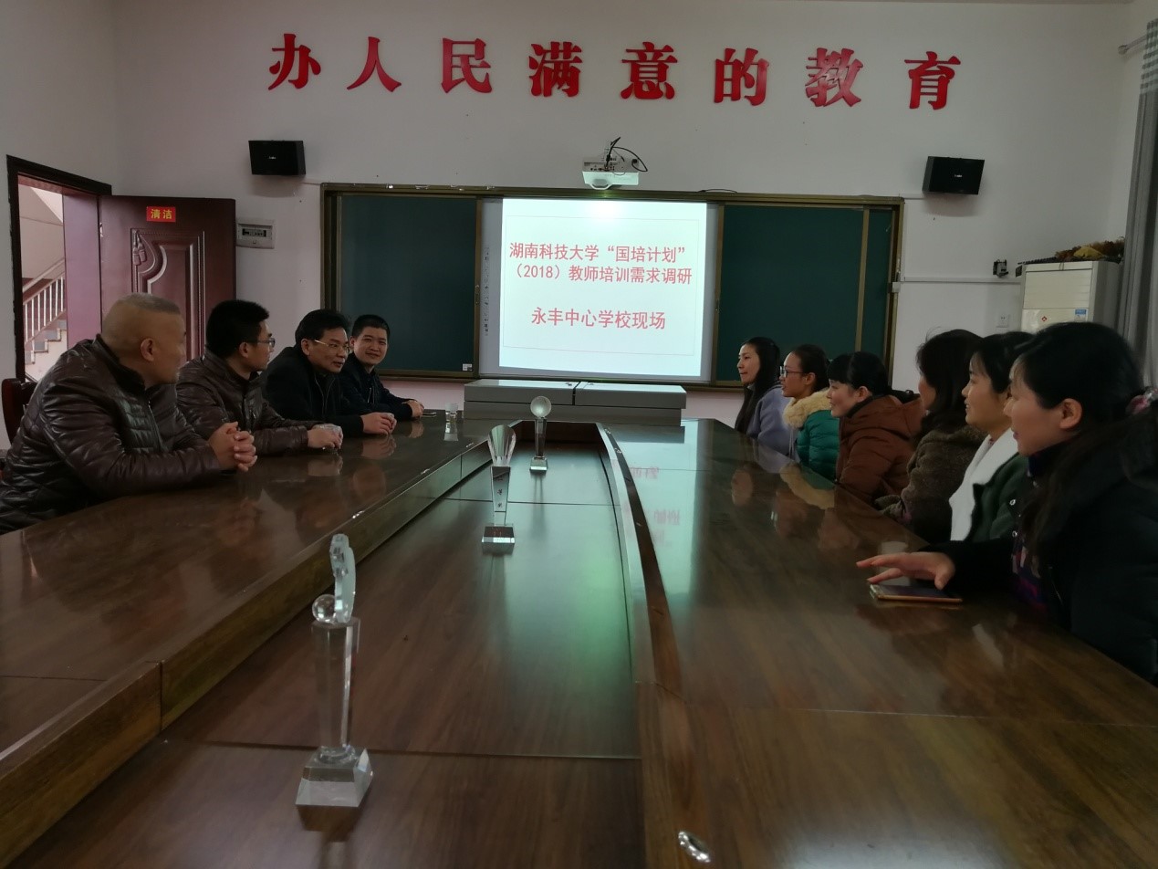 2017年12月29日,学院党委书记李炳煌教授带队,调研组赴双峰县永丰镇中心学校, 就“国培省培计划(2018)”如何更有针对性地满足乡镇中小学教师的培训需求,与该校领导、老师代表座谈。