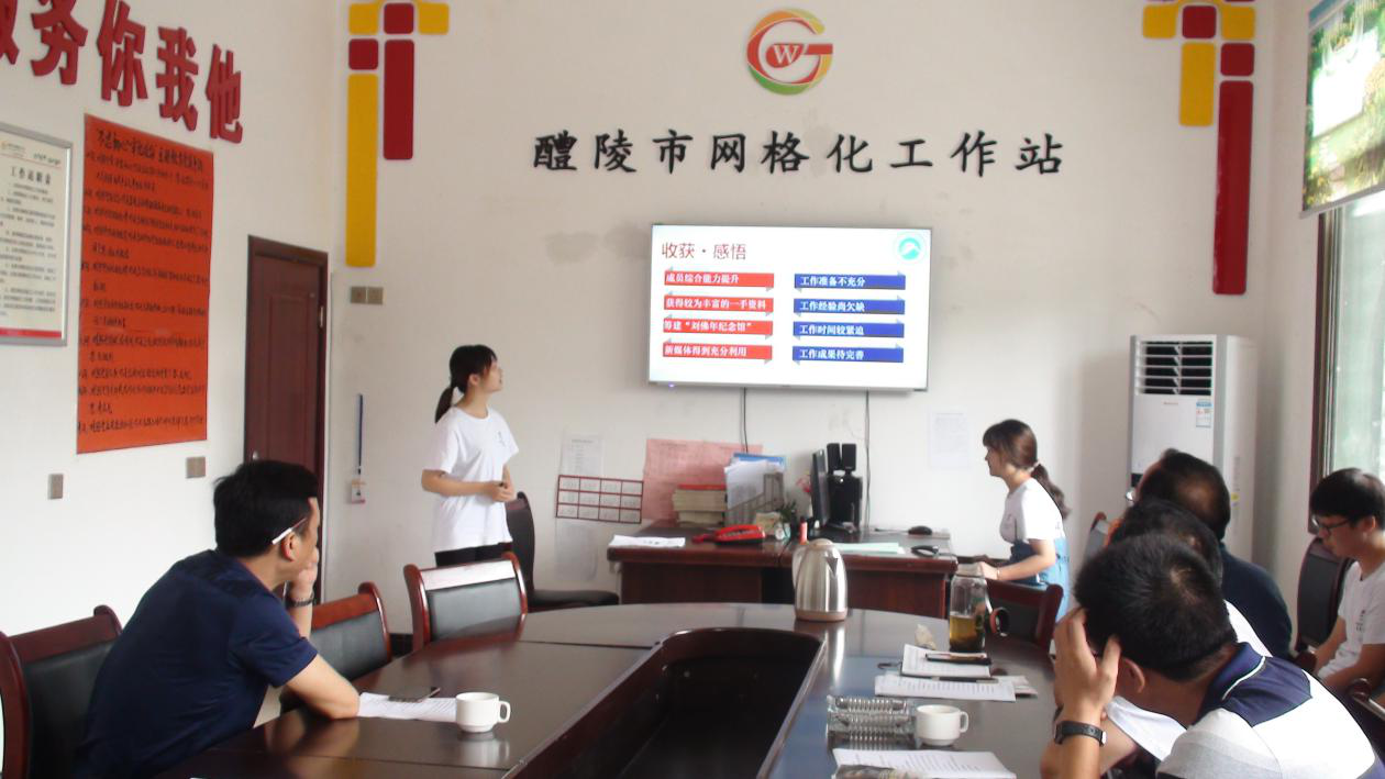 会议分两个阶段,第一个阶段是汇报和答谢,队长詹梦珍结合PPT向大家汇报了团队的工作,在五项主要工作中特别介绍了团队在筹建“刘佛年纪念馆”以及“调查访问”方面所做的努力。随后,团队成员匡文凯与谢倩分别从工作和生活等方面进行了汇报发言,以真挚的语言述说了本次实践的收获,并再次向提供帮助的领导和老师们致以深深的谢意。