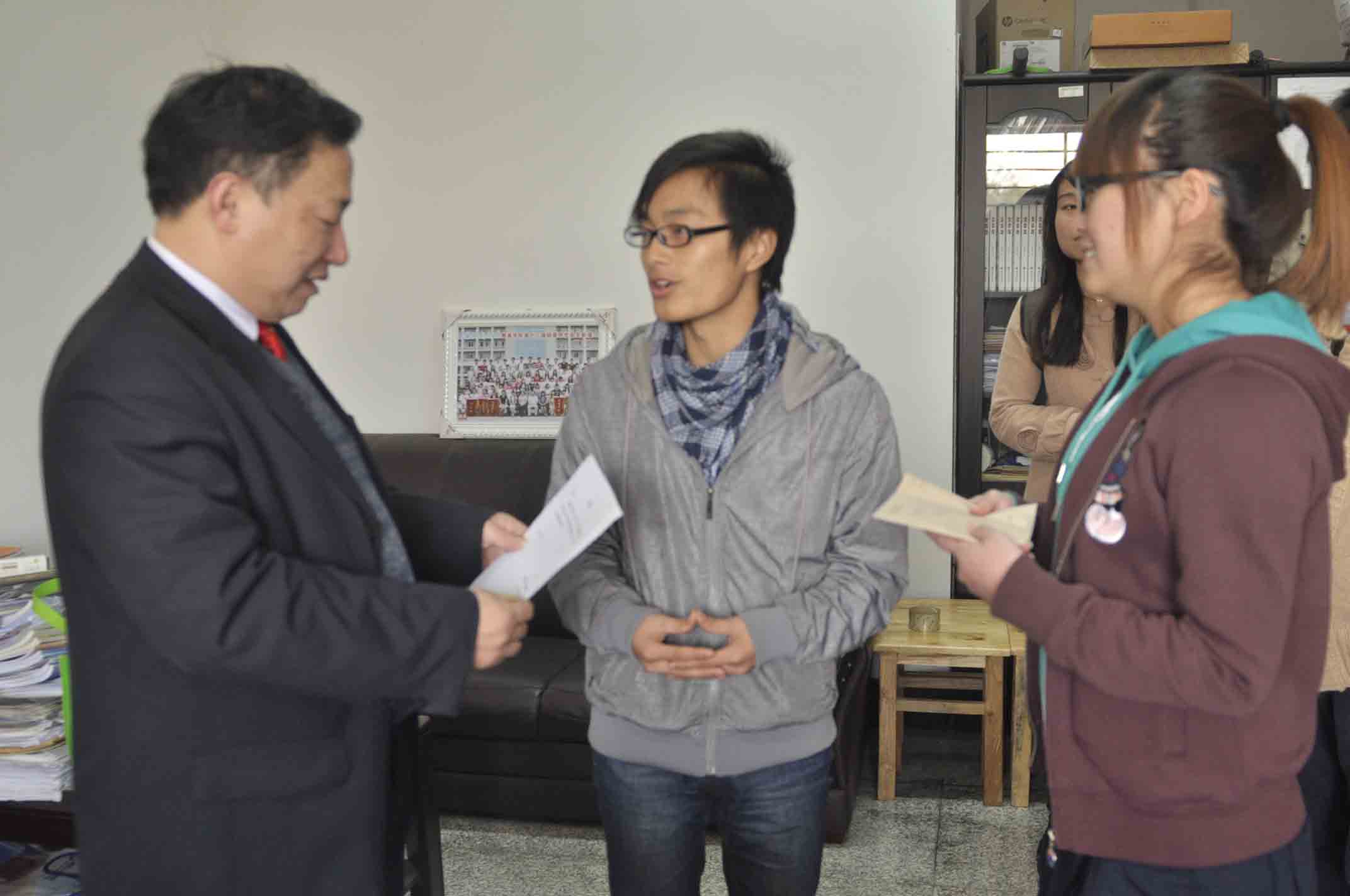 我们将爱进行到底,传递一份温暖。2012年12月5日下午,一场爱心接力活动在八教206正式举行,bevictor伟德官网党委副书记王伟清、胡 银华老师、尹琼芳老师为代表和bevictor伟德官网蓝翔助学协会代表谭泽威和 柳荣杰参与,并见证了此次交接仪式。