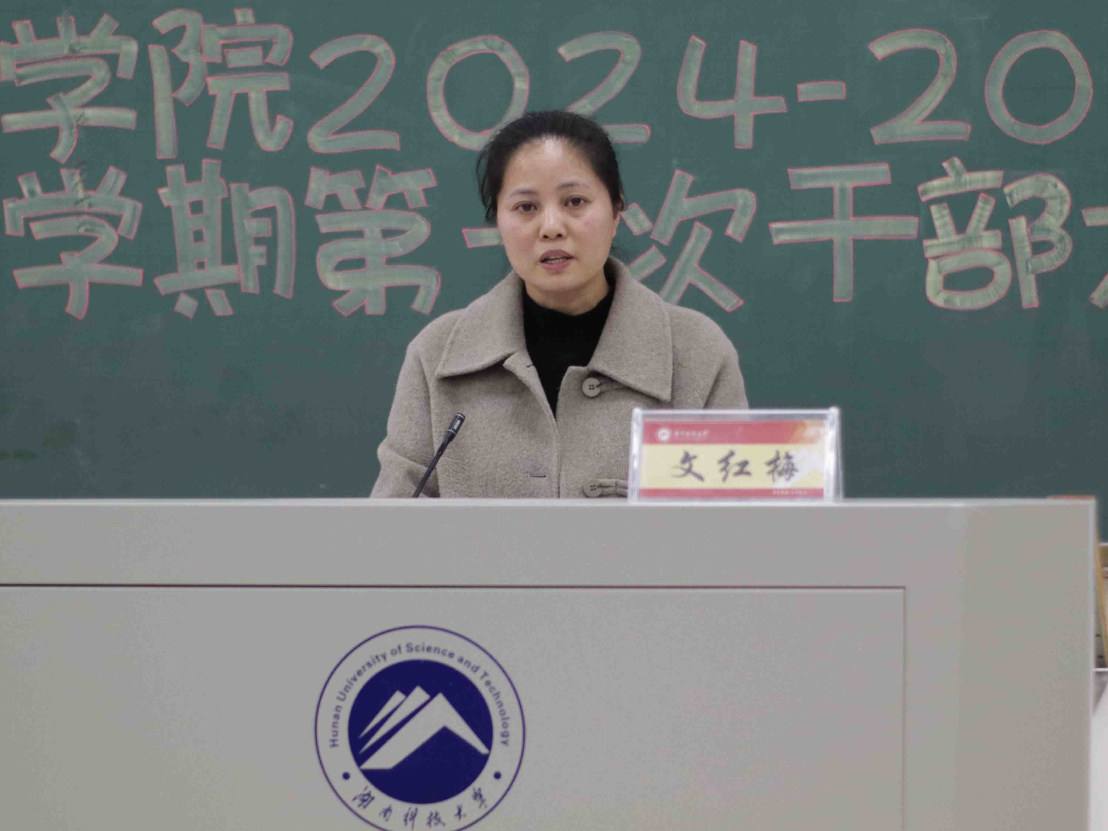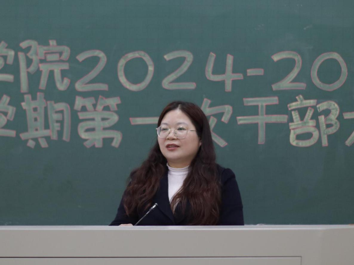 文红梅对学生工作进行总结,肯定学生干部在组织活动、服务同学中的表现,同时提出需改进的不足。她强调,学生干部应牢记服务宗旨,锤炼责任担当;平衡工作与学习,争做全面发展的“标杆”;做有温度、有深度的教育学子,为学院发展提供持续动力。