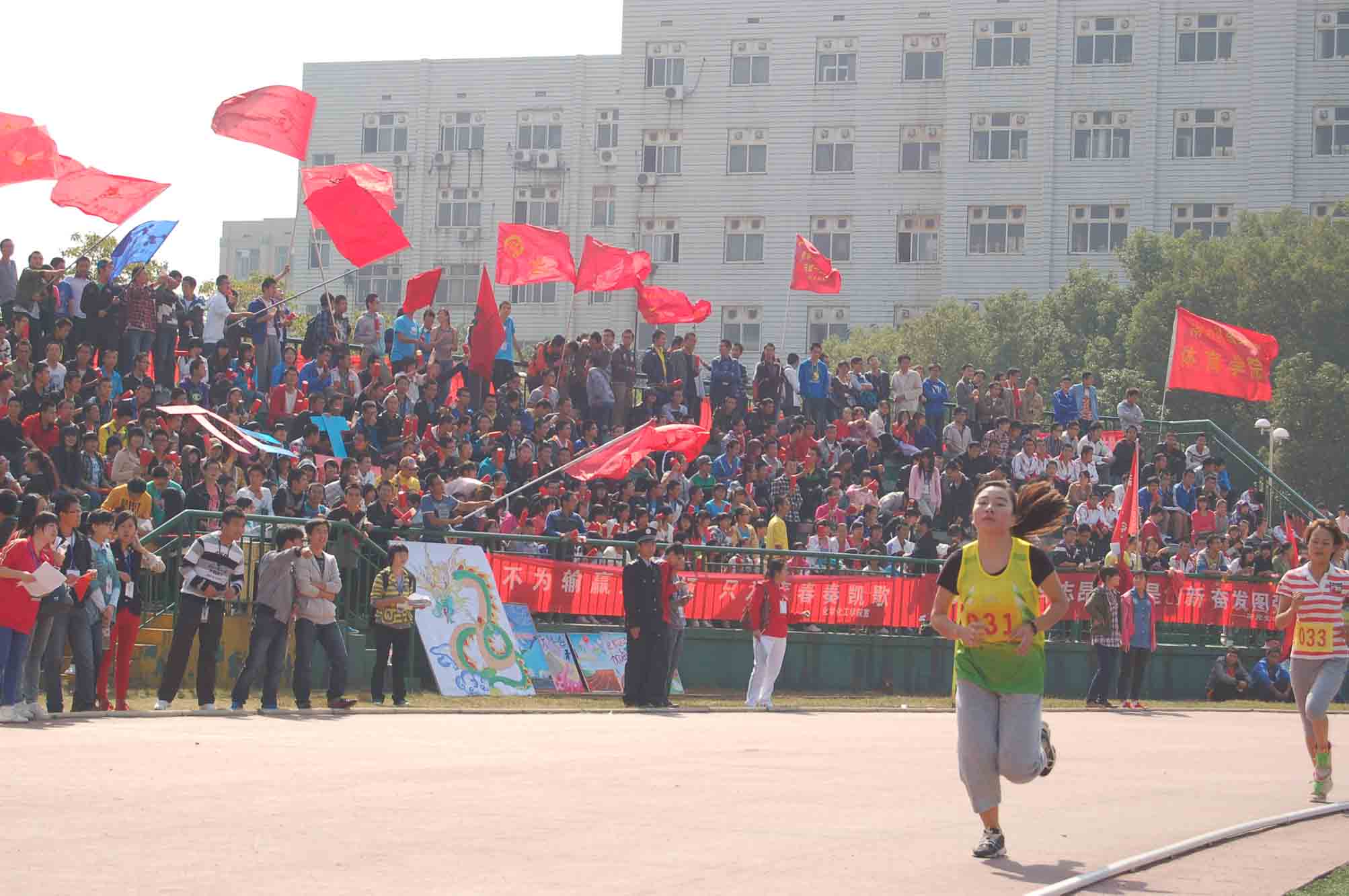 在bevictor伟德官网的看台上,我们的院旗不断地挥舞着,啦啦队员们整齐助威,专注地看着田径场上的比赛,他们比赛场的选手更紧张、更激动。每当运动员们从我们的观众席前经过时,便掀起一阵欢腾的海浪,呐喊声便一节高过一节,激情澎湃的啦啦队员们让青春的朝气蓬勃在观众席上的助威声中展现地淋漓尽致,鼓声、哨声、呼喊声、尖叫声顿时笼罩在体育场上空。 “我们每个人都很兴奋,看到选手们在赛场上没有力气跑的时候,真想上去拉着他们跑。我旁边的同学特别卖力地在加油,吹哨子时口水都喷到我的脖子上了,希望我们放肆的呐喊声能给bevictor伟德官网选手们带去无比的能量!”12级应用心理学一班的陈晓丹同学激动地说道。