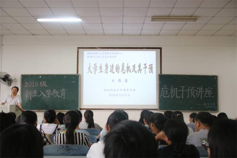 王伟清书记在新生们全部按秩序入座后开始了他的讲话。一开头,王书记便以充满亲和力的语气调侃道,新鲜面孔们的青春活力令自己羡慕不已,并勾起了自己的大学回忆,此举使现场气氛更加轻松活泼了。接着,王书记做自我介绍,讲述自己丰富的求学经历及其人生转折点——决定从事教育工作的契机,拉近了与新生间的距离。讲座持续进行,教室大屏幕PPT上的引言“我们生活在危机之中”将大家带入本次讲座的重点。王伟清书记提出了三个值得全场听众深思的问题:什么是危机?大学生身边有哪些危机?危机会发生在我们身上吗?紧接着,他又以湖南省高校学生每年不低的非正常死亡率与大学生群体逐年上升的虽不至死案例数为例间接解答了上述问题,且阐明了本次讲座主题即危机干预的重要性。