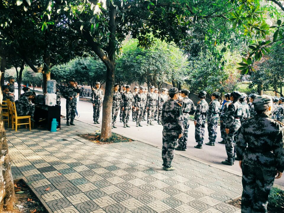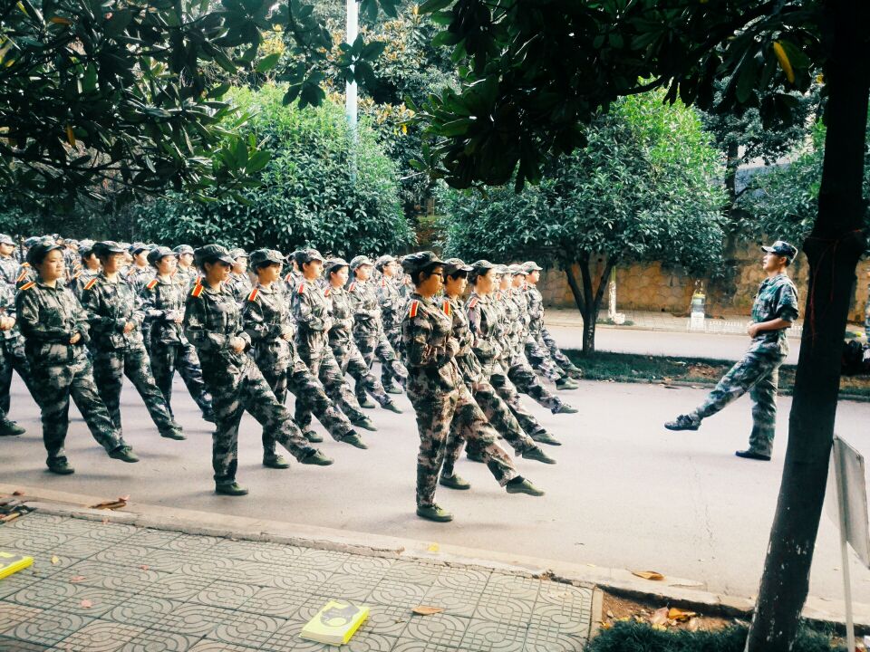 自9月28日起的军训操练已进行几日,国庆期间更是加紧训操力度,天色尚轻便要早班列队,迷彩军装应和国庆红日,坚硬毅影整务不乱。