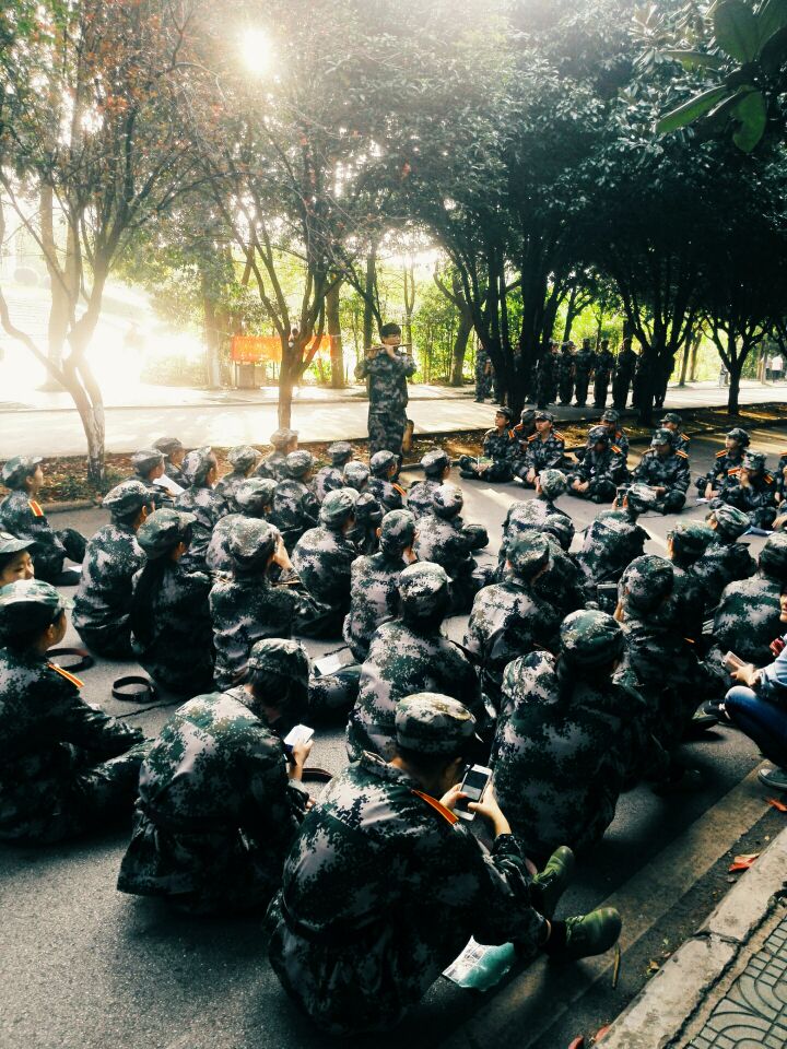 行道上有整排的树列,有渐浓的桂花味道,有新生全体台阶立挺的军姿。凑紧不紊的军训内容在教官指令示范下顺次排开,各排开始有分有和的整合训练,立正、稍息、跨立、跑步、齐步、正步……各项训练都在如火如荼的进行着。期间进行的军训合照也在分批进行,阳光遍布的地方,都有努力过的痕迹,画面定格在树缝和笑容之间。同时,各排各营之间也在紧训之余吹笛齐歌,松悦身心。