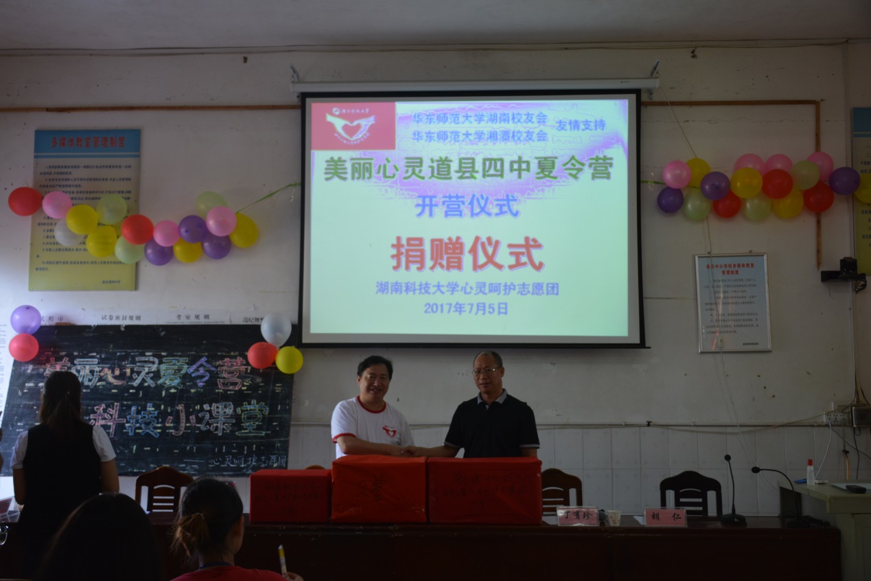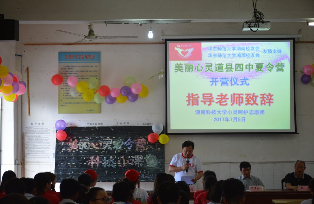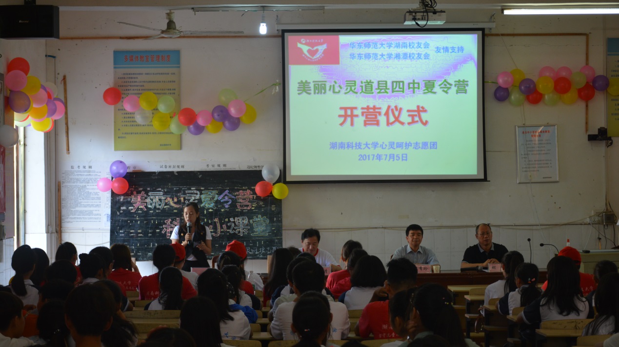 7月5日,上午九时,“bevictor伟德官网2017年研究生暑期科技服务项目”暨“美丽心灵——道县四中夏令营”正式开营。bevictor伟德官网留守儿童心灵呵护志愿团指导老师王伟清,道县教育局局长丁有珍,道县四中校长胡仁出席启动仪式,研究生暑期服务队全体成员及道县四中82名学生参加开营仪式。