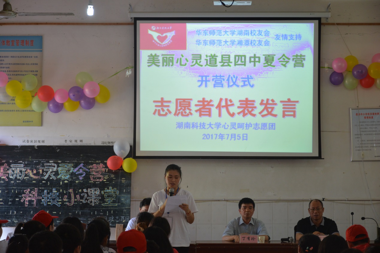 奏唱国歌结束后,道县四中校长胡仁致辞,他对服务志愿团的所有成员表示欢迎,并鼓励该校学生积极参与到活动中;观看完留守儿童心灵呵护志愿团宣传视频后,王伟清教授指出“留守儿童”属于当今社会的热点问题,儿童的心理情况应该受到学校,家庭和社会的高度重视,为孩子的成长创造一个良好的成长空间。之后,志愿者代表任艺在发言中表示,将秉承“务实”的志愿者精神,开展夏令营,给孩子们的暑假生活增添一道色彩。随后,道县教育局主任丁有珍在讲话中鼓励学生积极配合志愿团的活动,保证志愿团工作顺利开展。