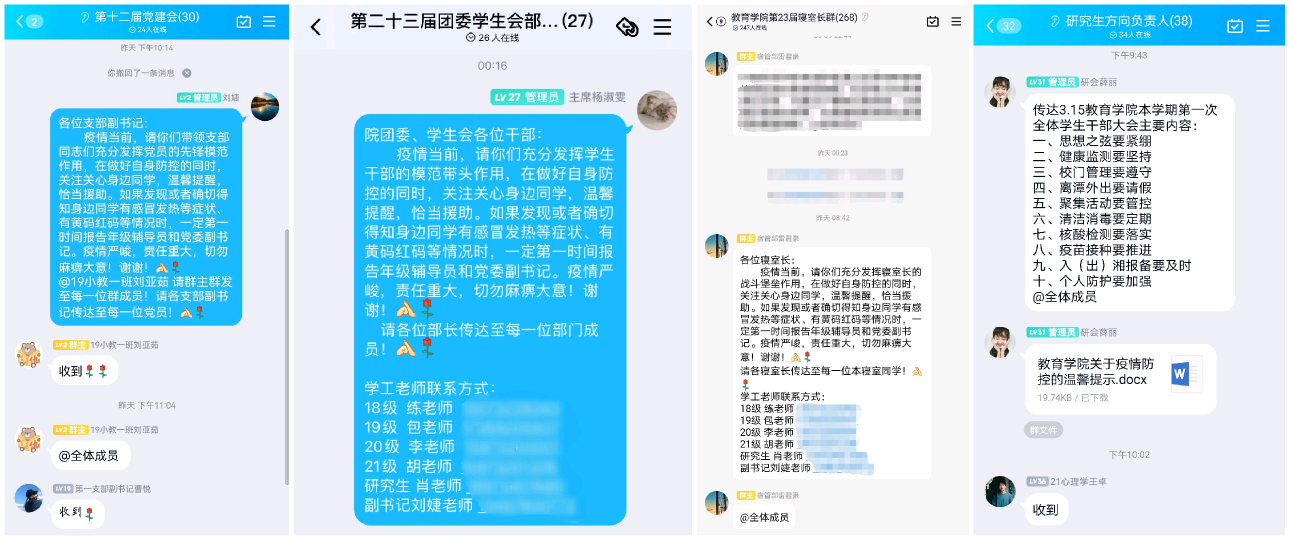 会议伊始,李涛就学校的疫情防控制度展开详细说明。他强调,现在离开湘潭要做好相应登记,要随时和年级辅导员联系,不举办大型集会活动和线下学生会议,各寝室要保持卫生清洁。提到近日学校的核酸抽检,他希望权益保障部拿出具体方案,安排好各班核酸检测的顺序。在讲到班级疫情防控管理时,李涛重点提到班级内部要开一个专门负责疫情防控的会议,各班班委都要承担责任,不要盲目转发群里的消息,要认真将各项事情落实到地。