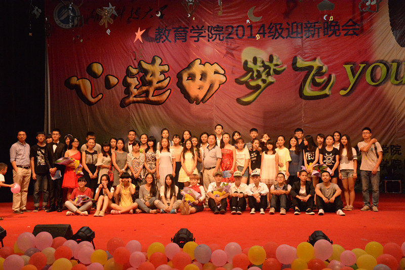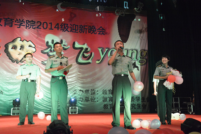 我们纵情高歌,歌唱美好未来。歌曲联唱《朝花夕拾》,乐器演奏《梁祝》,清脆的嗓音,悠扬的笛声,将教育学子的多才多艺展现的淋漓尽致。更是有那么一群人,他们自己不是新生,却和新生一起在烈日下出行,他们就是可爱的助班和可敬的教官。短暂的告别,眼里饱含着泪水,不苟言笑的他们更是用着歌曲《如此荣幸遇见你》和《战友你还记得吗》展现着自己的“心迎新”的可爱模样。 飞扬青春