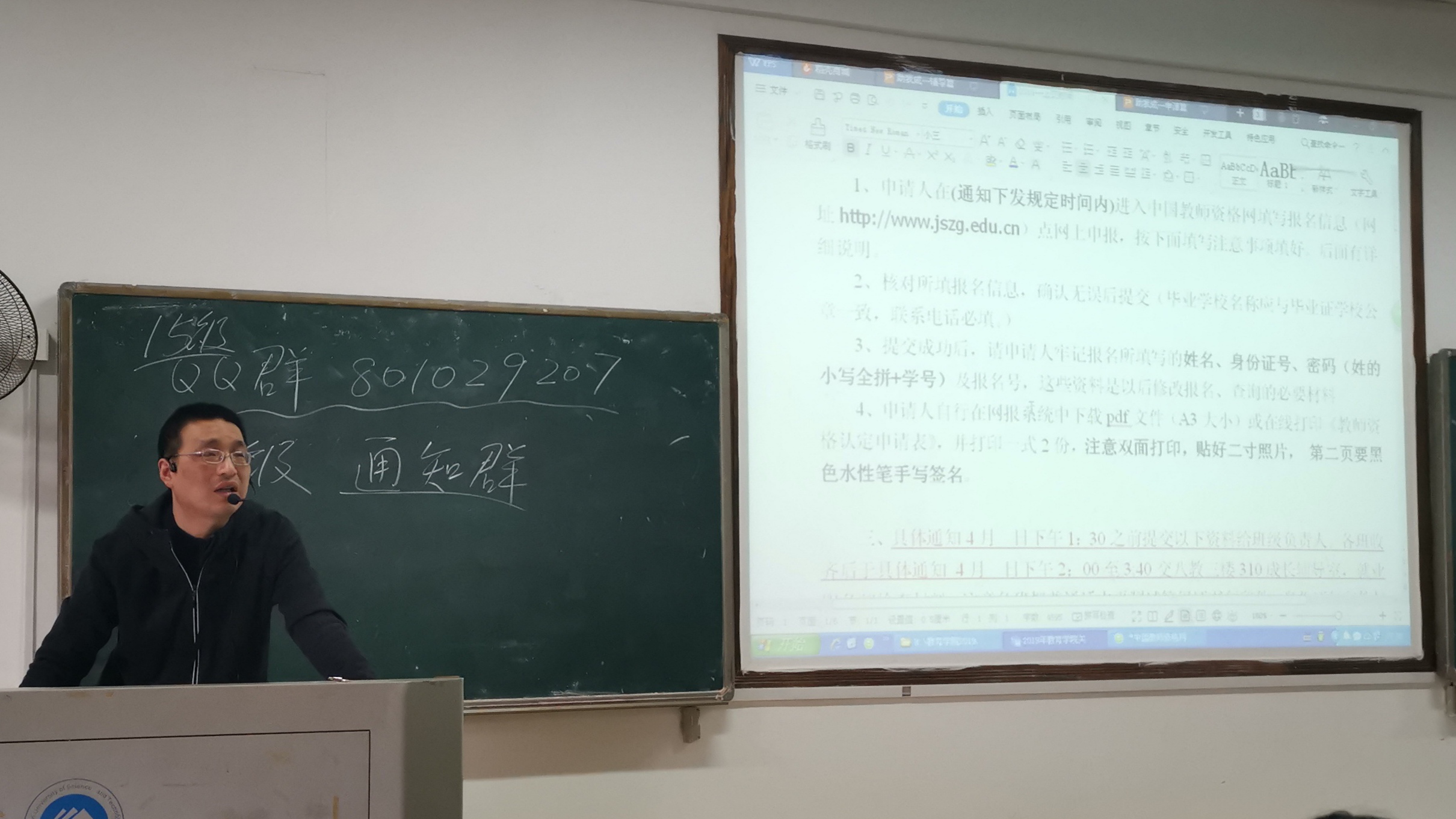 本次会议主要介绍了申报教师资格证的过程和相关细节要点。首先需要在规定时间内进入“中国教师资格网”,登录“未参加全国统考申请人网上报名系统”,填写个人材料报名并打印《教室资格认定申请表》,并在之后准备相关材料进行现场确认报名信息。接着,李涛就教师资格证申请所需的普通话证书原件及复印件、学历证明、《思想品德鉴定表》、《湖南省教师资格证认定体检表》、成绩单等相关材料的准备及填写做详细指导。对于小学、初中、高中不同级别的教师资格证申请问题,他也分别做了相应的全面指导。会议结束后,同学们还踊跃地向辅导员询问,确保了解清楚。