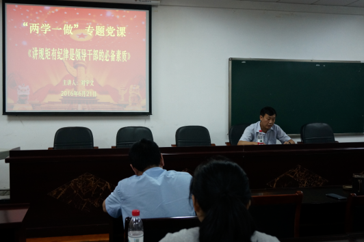 2016年6月21日下午在bevictor伟德官网408室,校纪委书记刘宇文同志为联系点基层党组织讲“两学一做”专题党课。专题党课由bevictor伟德官网党委书记谭建平同志主持,校纪委监察处、审计处党支部党员、bevictor伟德官网党委教职工党员、外国语学院翻译学生党支部党员参加学习。
