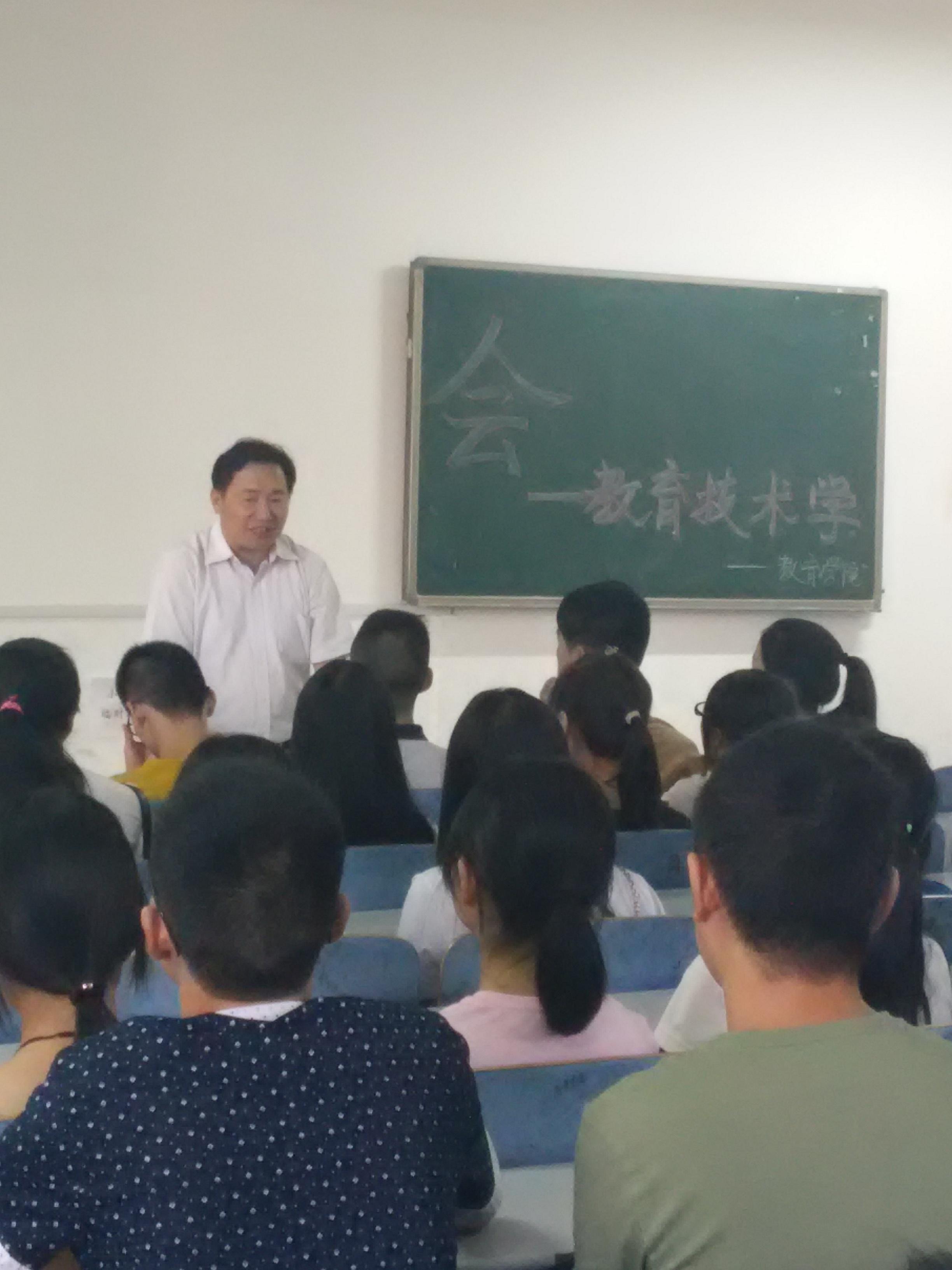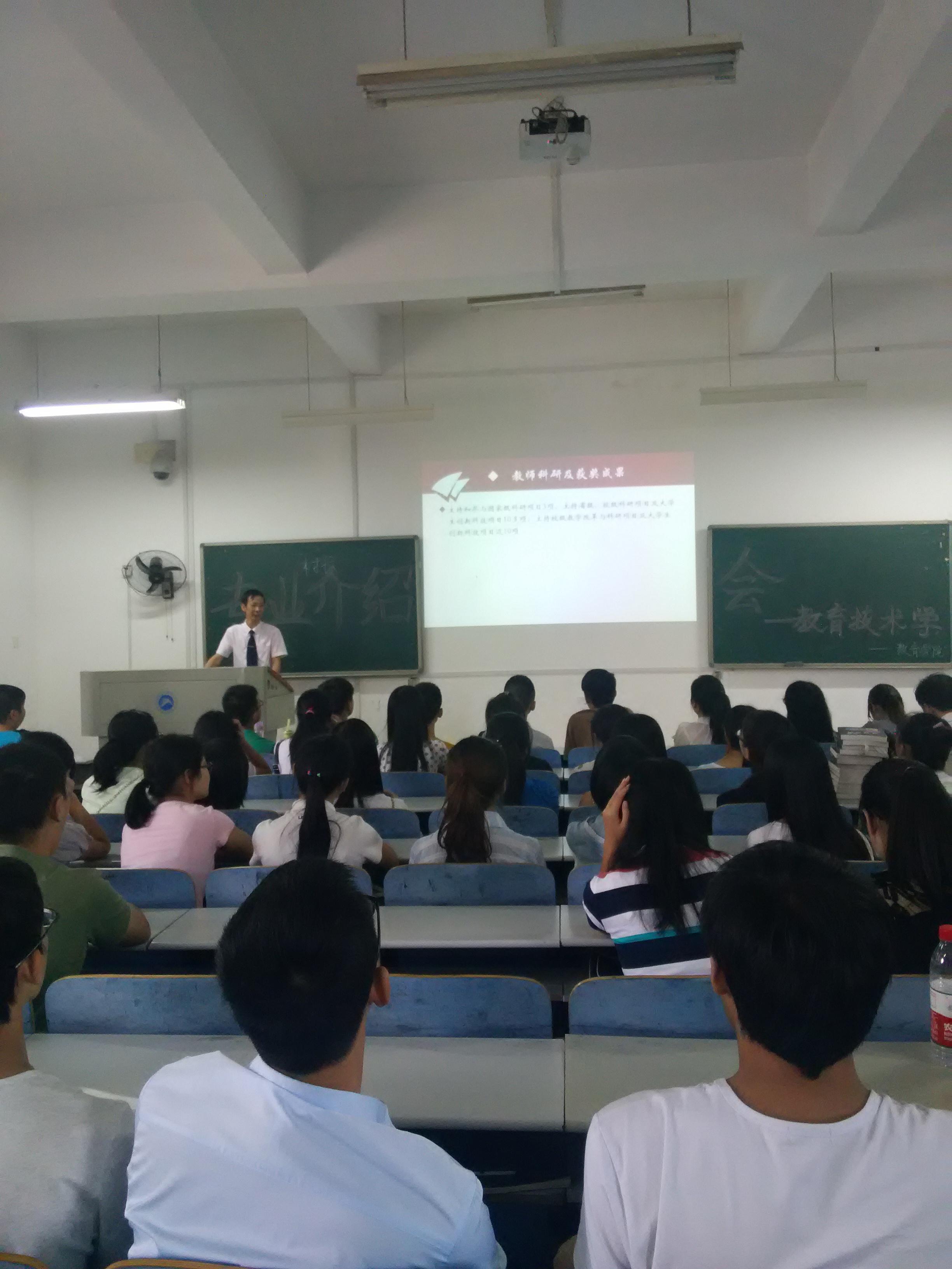 在2-1教室,院党委副书记王伟清教授,教育技术学系主任杨世伟教授,辅导员胡银华老师主持了15级教育技术学的专业介绍会。杨世伟教授就本专业的基本情况,人才培养,招生就业,要求希望四个方面做了详尽的介绍。他客观分析了教育技术学的专业办学历史,专业师资队伍,教师科研及获奖成果,实验条件等具体情况,力图帮助学生树立一个全面立体的专业观。同时在专业的人才培养方面,在明确了四大课程体系,两大培养方向的前提下,提出了毕业生应该具备的能力的具体目标。最后就往年毕业生的发展情况向同学们提出了努力学习以夯实专业基础,参与活动以培养全面技能等四项要求,饱含为人师表对一群稚嫩懵懂的学生的殷切希望。同学们专注眼神,微笑的面庞似乎也在传达着他们对于专业的向往之情。
