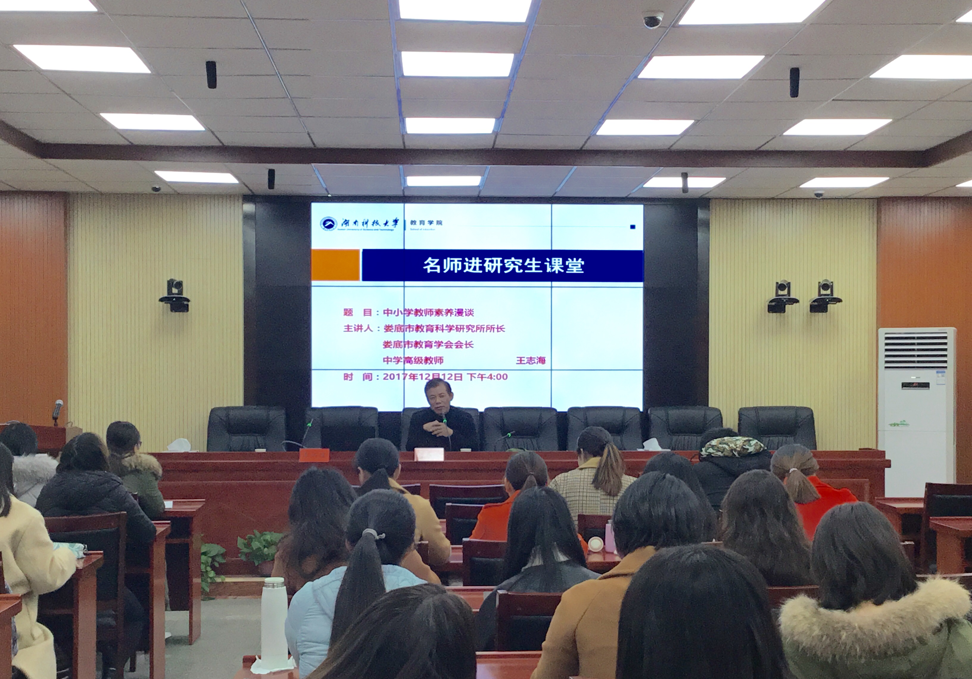 2017年12月12日下午,娄底市教育学会会长、中学高级教师、娄底市教育科学研究所王志海所长莅临我校,在八教308教室开展题为“中小学教师素养漫谈”讲座,2017级全体教育硕士专业研究生和bevictor伟德官网部分本科生参加了本次讲座,讲座由bevictor伟德官网党委书记李炳煌教授主持。