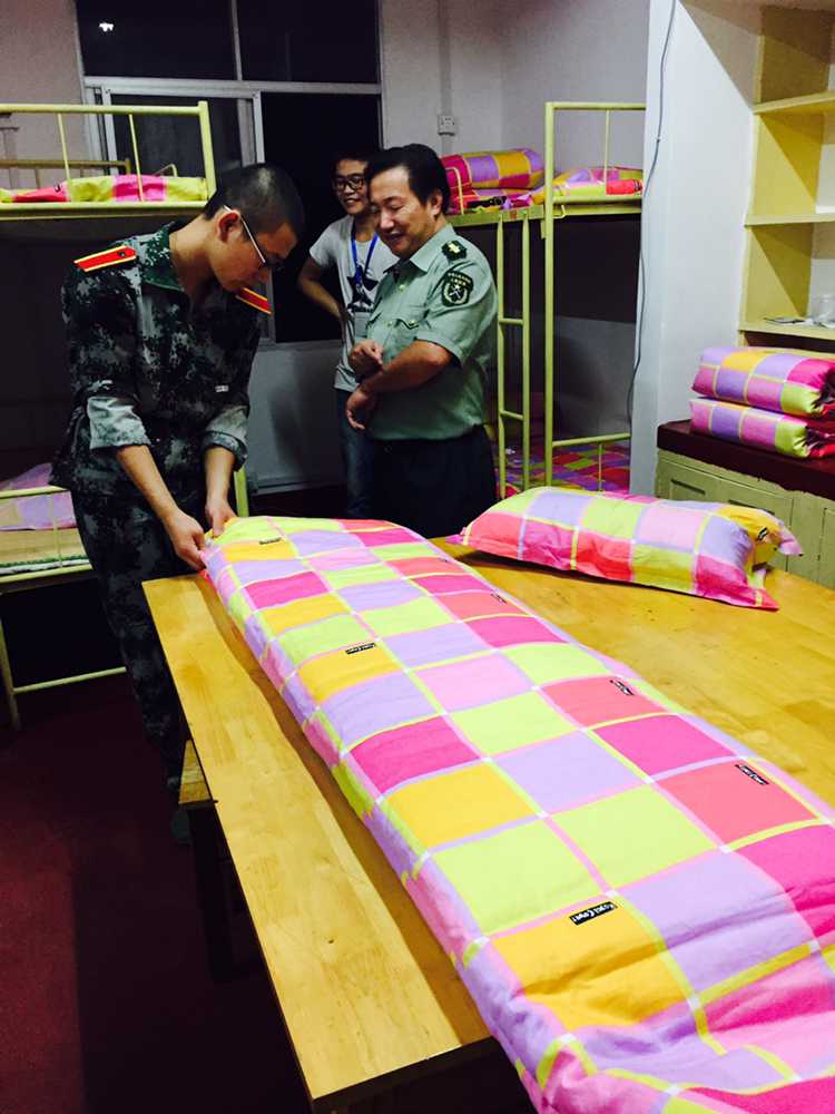 一天的辛苦训练后,新生们回到寝室,然而并不能休息,回到寝室只是做另一件事的始。“这个寝室的厕所不干净”“垃圾桶没有摆放好”“四个人的杯子摆放角度不一致”“这里有灰”“军训期间一律遵循半军事化管理”“内务整理不合格”每一个寝室都在热火朝天的进行内务的整理,虽然检查的结果偶尔并不尽人意,但是大家仍然在每一个寝室学生干部的指导下认真的整理着。“日落西山红霞飞,战士打靶把营归,把营归。”不知道哪个寝室起了头唱起了教官今天新教的歌整个楼层都一起附和起来,时不时的欢笑声和吐槽声让每一个一天的紧张都放松下来。